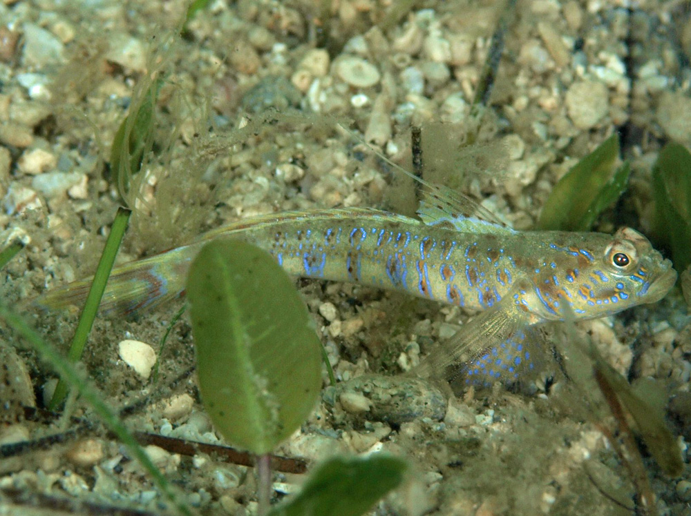 藻場で出遭ったのですが、「腹鰭は黄金色で、青色点が密在し、縁取りはない」という特徴から同定しました。
