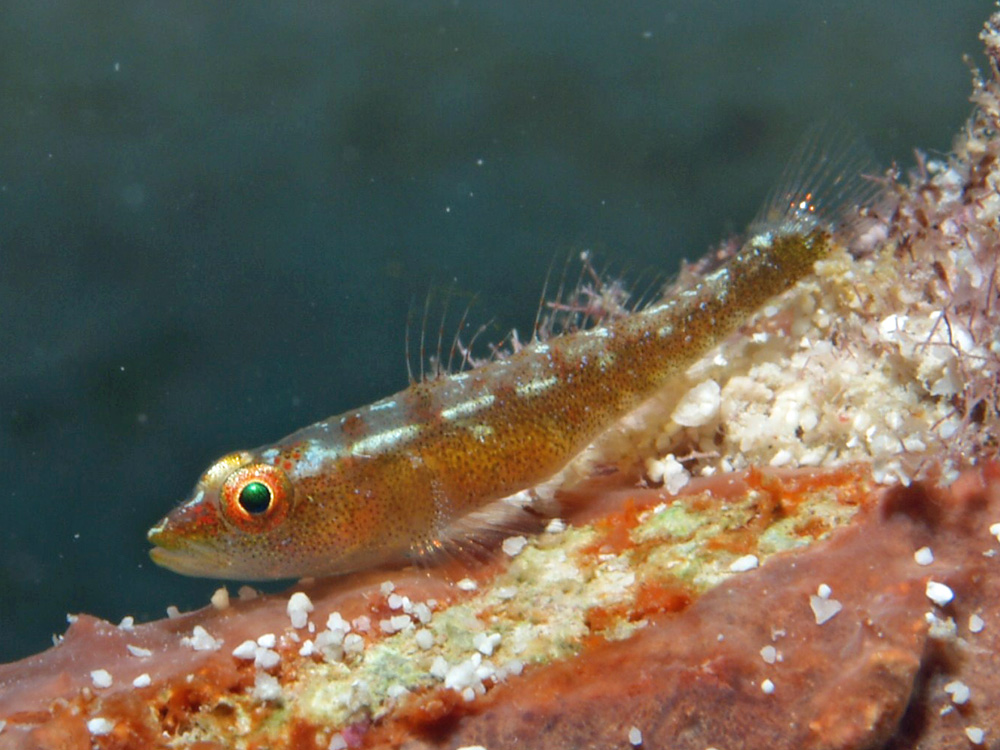 撮影 2008/09/02 沖縄県 竹富島 掲載 2013/03/16 ⇒ハゼの仲間 透明っぽかった前掲の個体に比べると随分と微小斑点が目立ちます。そのせいか、体色も濃く思われます。 第1背びれ起点から以降の体側に6赤褐色横帯がある点と尾びれ下部が赤褐色であることからガラスハゼとしました。
