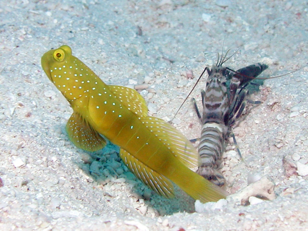 黄色個体。 共生エビはホリモンツキテッポウエビ。