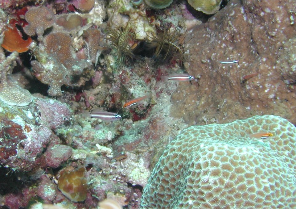その点を除けば両者は瓜二つで、もしかしたら同一種のバリエーションじゃあないかと疑っちゃいます。 (黄色っぽいのはシロオビイソハゼ)