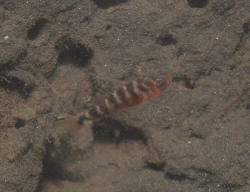 当時のコンデジでは泳いでいる小さな魚を撮るのは難しく、さらに、着底すると砂泥が崩れてしまうので自分も中性浮力を取りながら体を浮かしての撮影だったこともあり、ずいぶん努力したのに掲載した写真が(これでも)ベストです。