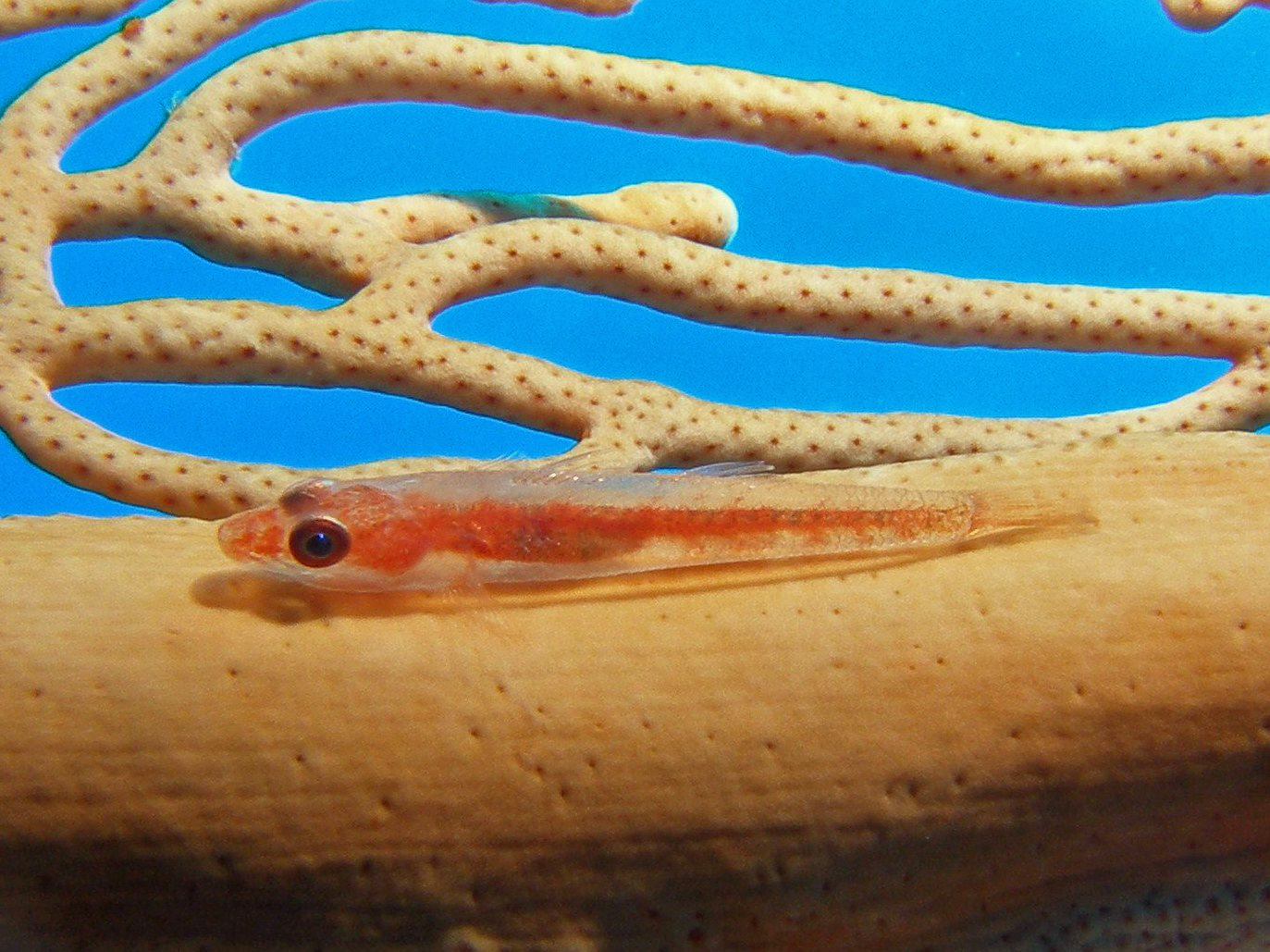 「ウチワヒラヤギに複数で着生する」と解説されていますが、この写真もそのウチワヒラヤギにくっついているところを撮ったものです。動きが鈍いというか、ないというか、カメラを構えても、ストロボを光らせても、全く何の反応も示さずにただただジーッとしていました。ずいぶん肝の据わった魚です。