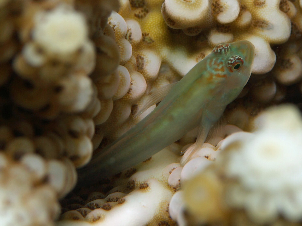 撮影 2008/08/17 沖縄県 石垣島 掲載 2013/03/02 ⇒ハゼの仲間 タスジコバンハゼとそっくりな体形・体色や枝サンゴの中という生息環境からするとコバンハゼ属の1種なのは明らかですが、この属に多い水色横線がありません。 水色横線が頭部から尾部まであればタスジコバンハゼなんだけどなー。