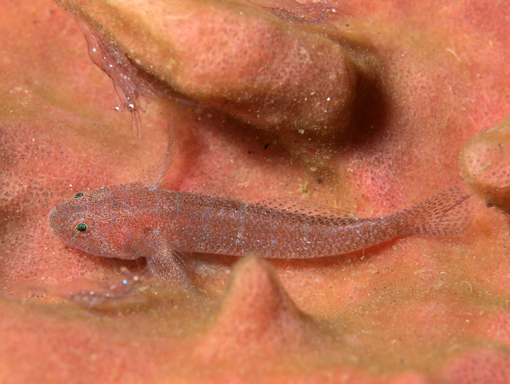 直径30cmほどのツボ状カイメンの中をのぞいたら環境に合わせた体色・柄の目立たないハゼがいました。