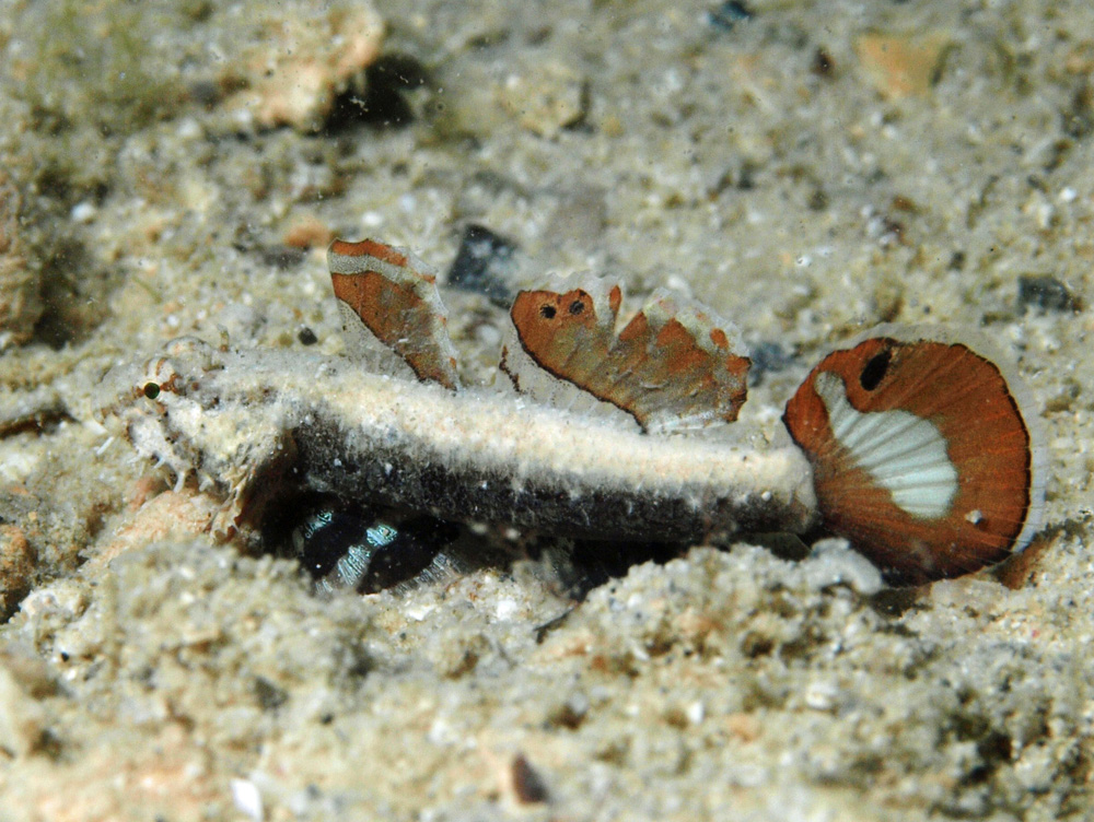 背鰭が伸長していないので雌です。『日本のハゼ』 瀬能宏/矢野維幾/鈴木寿之/渋川浩一 (2004年初版 平凡社)480ページにハゼ科の1種-14として掲載されています。