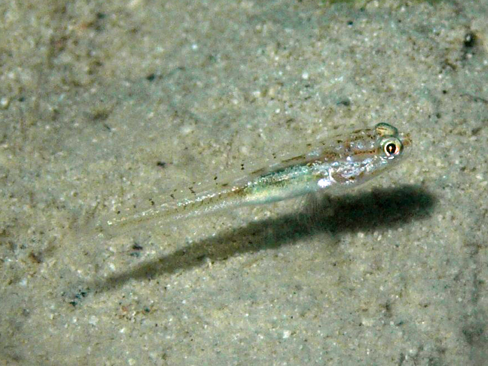 撮影 2008/09/09 沖縄県 石垣島 掲載 2013/04/09 ⇒ハゼの仲間 幼魚が撮れたので追加しました。 成魚の個性的な色柄はまだ全く出ていなくて、半透明の体に黒い細点がわずかに散らばっているという超地味なお子さまです。