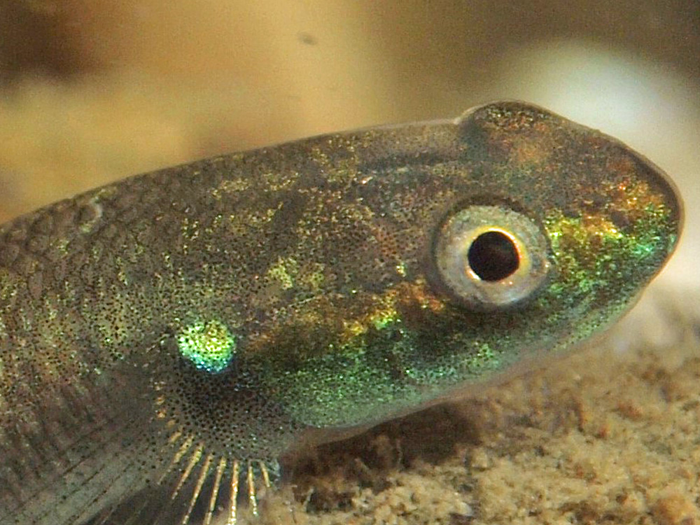 という訳で頭部のギラギラを追加しました。この魚の全長は4pほど。頭部は1pなので、だいぶ拡大しています。