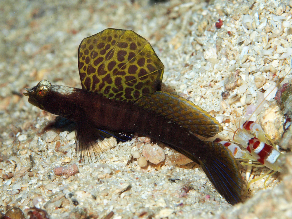 第2背鰭と尾鰭も開いていて、コトブキテッポウエビも顔を出している写真が撮れたので追加しました。