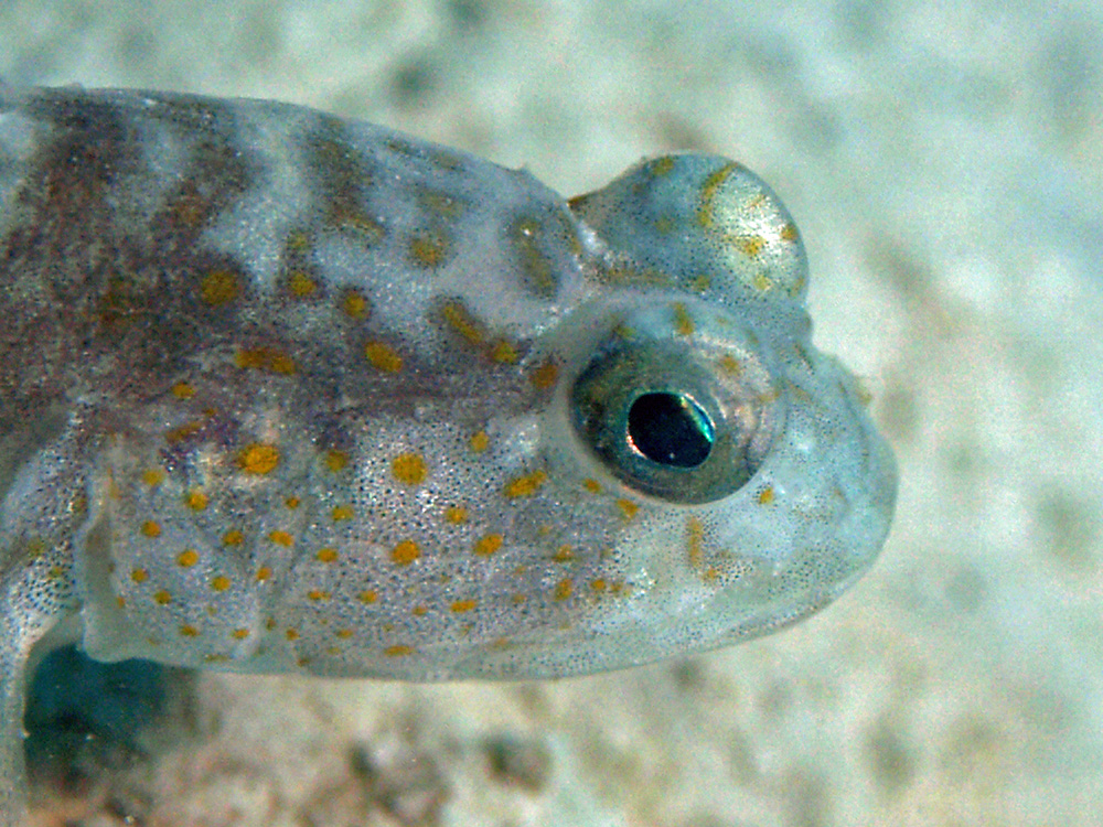こうして見ると黒細点が全体に散りばめられていますが、眼の後ろ上部は黄色斑点の部分だけ黒細点が散っていて、白色部分は黒細点がありません。
