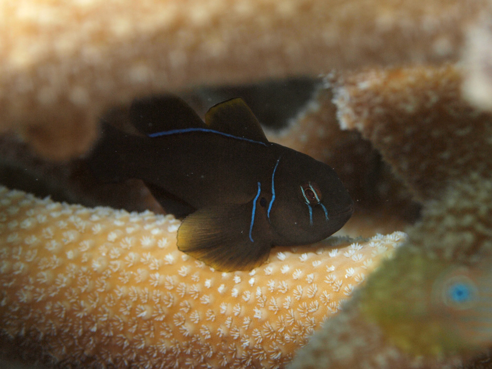 込み入ったサンゴの枝の隙間に一瞬姿を現したところを狙ってカシャ。またカシャ。またまたカシャ・・・