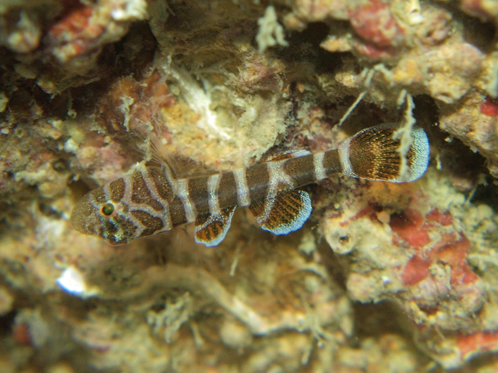 撮影 2013/07/31 沖縄県 沖縄島 掲載 2016/10/20 ⇒ハゼの仲間 幼魚です。成魚とはちょっと違う印象で、知らない人は親子関係を疑うことでしょう。ヒレを縁取る太めの白帯がチャーミング。