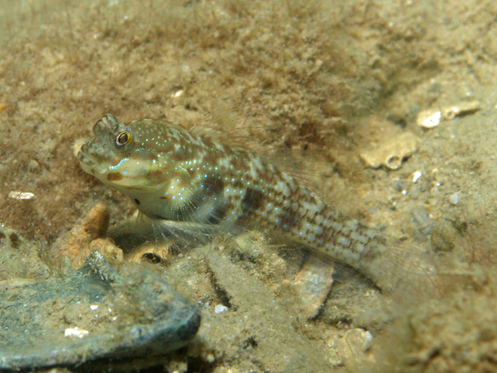 分かりやすいのは眼の下に斜めに走る水色の線で、これはすべての資料で共通して確認できる特徴です。ボクの写真もその特徴からコトゲハゼと同定しました。
