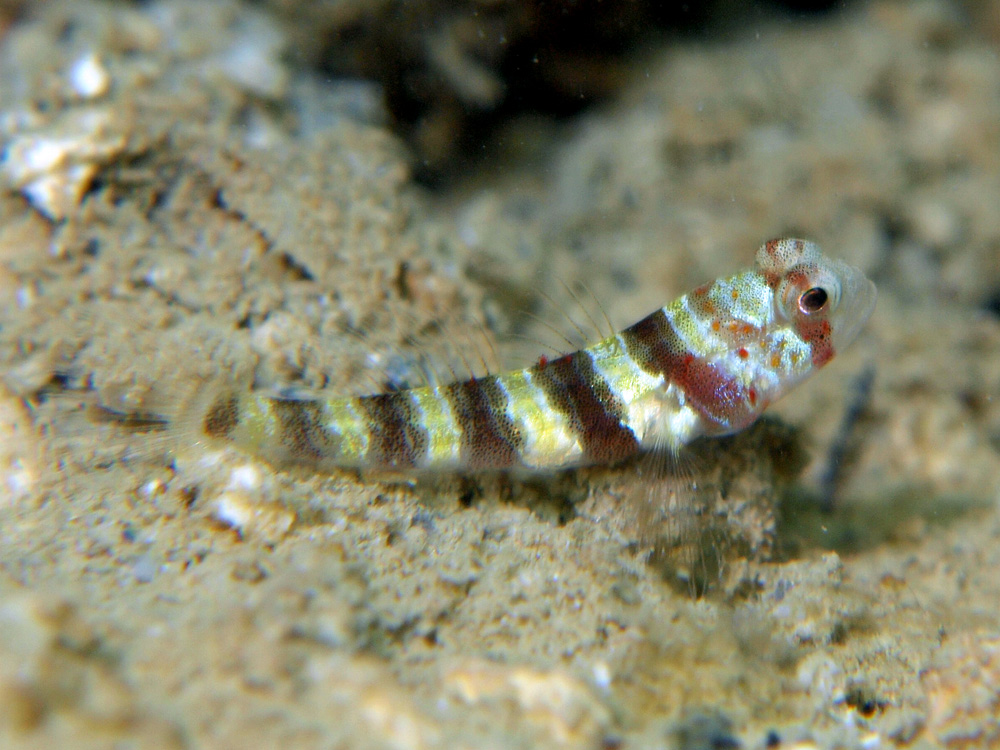 撮影 2012/11/02 沖縄県 沖縄島 掲載 2015/12/31 ⇒ハゼの仲間 成魚に比べて幼魚は頭でっかちなんでしょうか? 哺乳類だけでなく、魚類でもあどけなさがあるように思えてなりません。この被写体もあどけなくて可愛らしいオコチャマです。