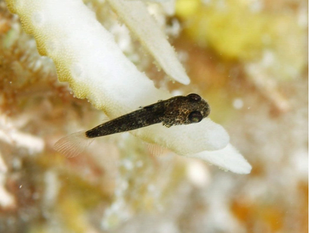 撮影 2008/08/11 沖縄県 竹富島 掲載 2013/02/21 ⇒ハゼの仲間 まだ黒色がマバラで鰭が透明な稚魚段階のクロダルマハゼです。 水中目視で全長が5o以下。その小さからしたら、よくぞこれだけに撮れたものだと自分をほめてあげたい気分です。