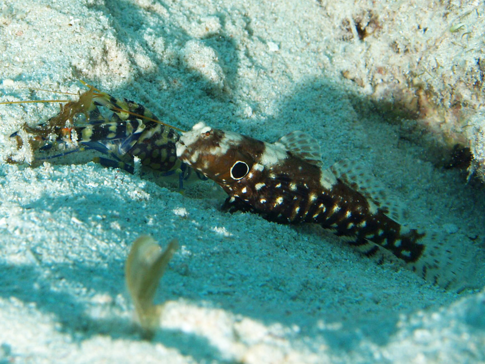 共生しているのはクマドリテッポウエビで、このエビはこの種類とのみ共生するそうです。そんなえり好みをしたら相手を選ぶのが難しいと思うんだけどねえ。