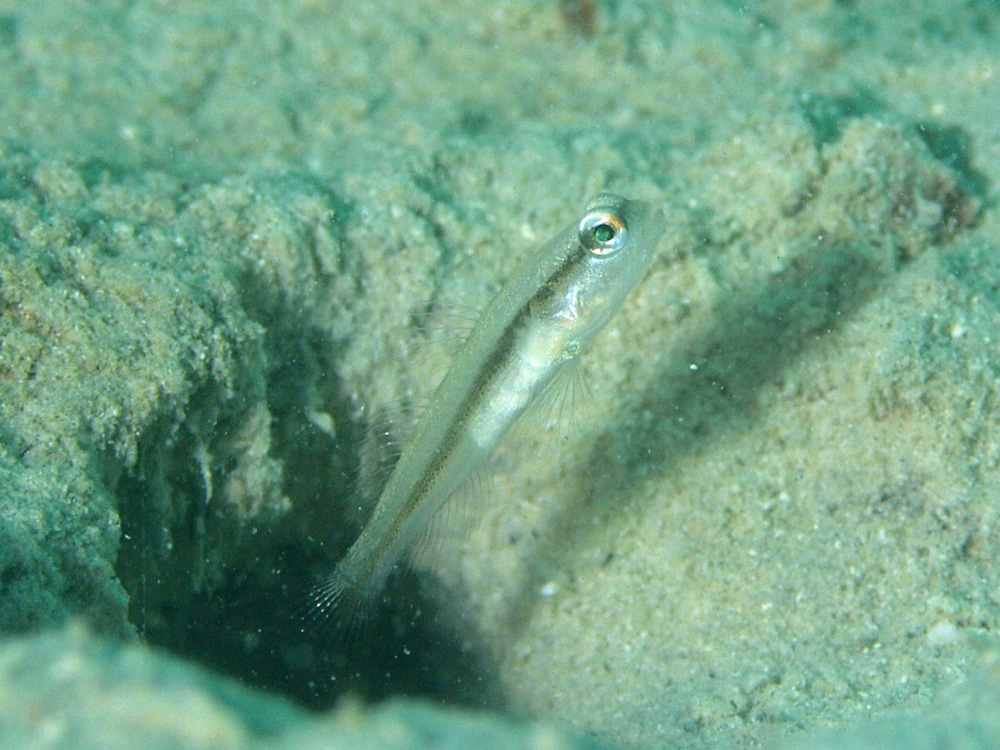 撮影 2008/10/06 沖縄県 石垣島 掲載 2013/01/21 ⇒ハゼの仲間 こちらは全長5pほどのお子ちゃまです。 名前の通り体側に黒帯が走っていますが、ヒレは成魚とちがって透明です。 成魚よりも細く見えますが、それは撮影角度のせいかな〜?