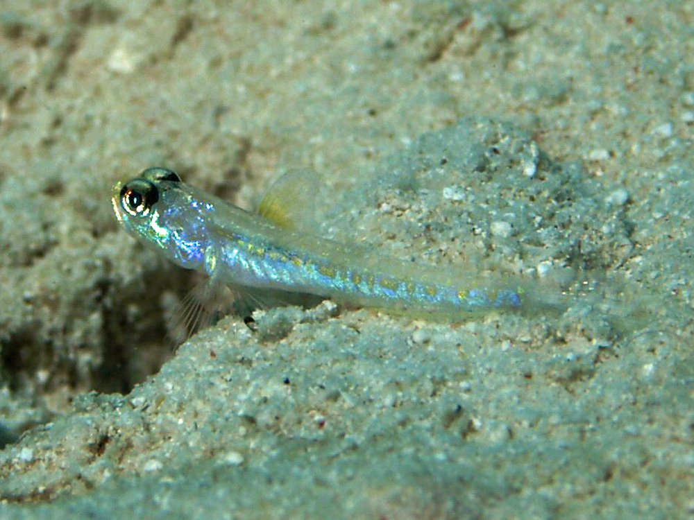 撮影 2008/09/01 沖縄県 石垣島 掲載 2013/03/10 ⇒ハゼの仲間 幼魚です。まだ体にも背鰭にもクサハゼ特有の豪華な模様が出ていませんが、薄いブルーと黄色の模様は儚げな美しさがあります。しかも頭でっかちの子ども体型が幼さを強調して、幼魚好きのボクとしては「カ、カ、カワイイ〜〜〜」。