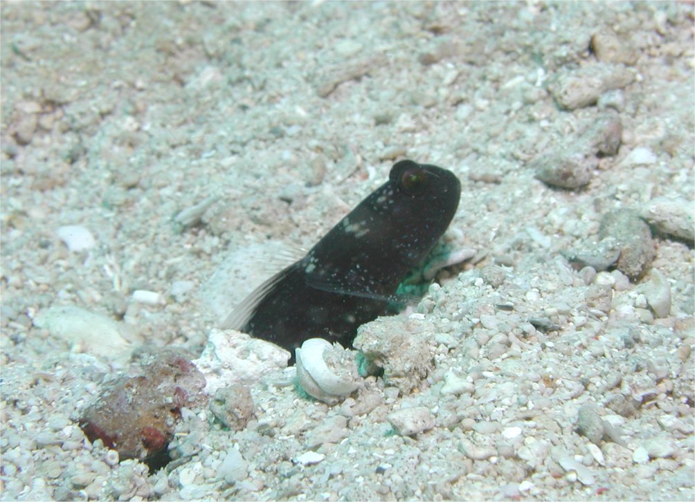 砂地の斜面のあちこちに共生ハゼがいる、ハゼ好きにとってはとても好ましいポイントだったのですが、潮が斜面の横方向に強く流れていて、指示棒を砂に差し込んで体を支えようとしても体が持っていかれてしまい、写真を撮るどころではなかったことを懐かしく思い出します。