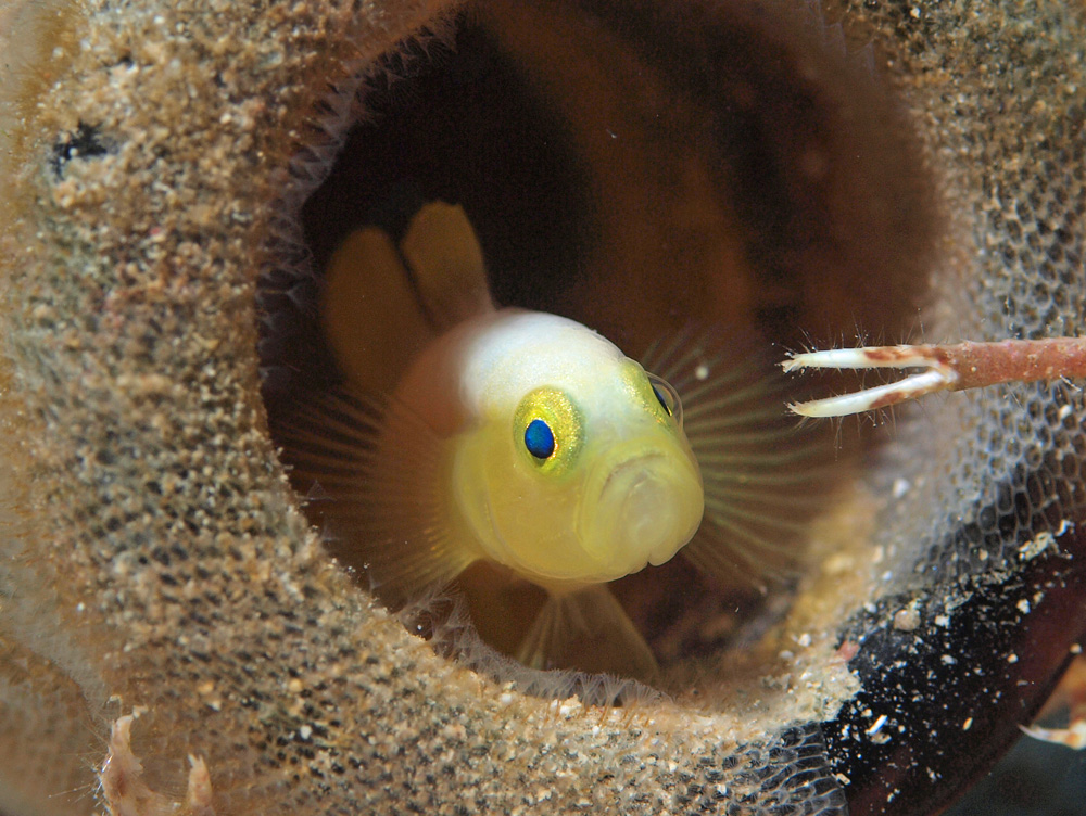 ということで目出度く初掲載。ワ〜イ、やった〜! (ナカモトイロワケハゼの首をちょん切ろうと狙っているハサミはコシオリエビのものです。)