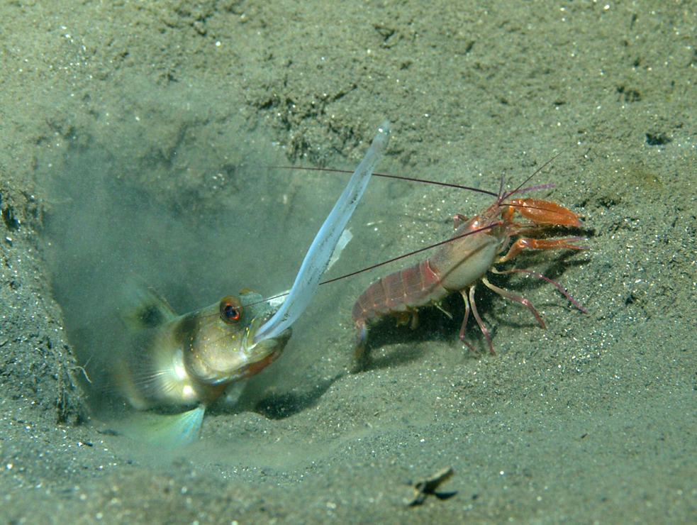 ハゼの捕食シーンには無関心にセッセと巣穴の補修に励んでいる様子がボクには奇妙に思えたのですが、彼にとっては珍しくも何ともない日常生活のひとコマなんでしょう。