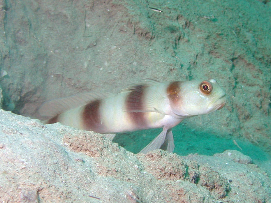 撮影 2003/05/19 フィリピン セブ島 マラブヨック ⇒ハゼの仲間 ダテハゼと似ていますが、黄帯の本数が違う(向こうは5本、こっちは4本)のと、チョッと分かりにくいのですが太い横帯間に薄黄色の細い横帯があります。