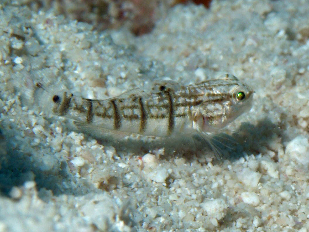撮影 2008/09/02 沖縄県 竹富島 掲載 2013/03/16 ⇒ハゼの仲間 幼魚。一般的には幼魚の方が色彩が派手だったり、模様が変わっていたり、体型やヒレががユニークだったりしますが、どうやらこの種類は逆のようです。