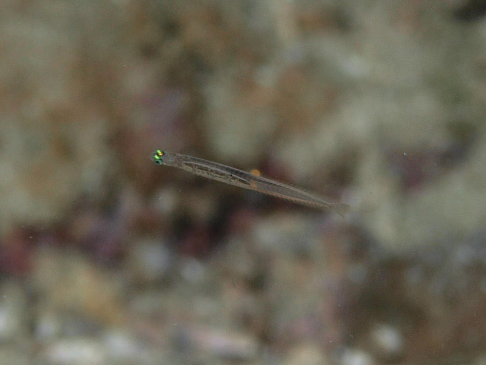 肉眼で5〜6cmといった全長で、体の透け具合からして長細い魚の稚魚(または幼魚)と思われます。と、それだけで、そこからの進展は一切なし。ボクのような一般人には手も足も出ません。ハア〜。