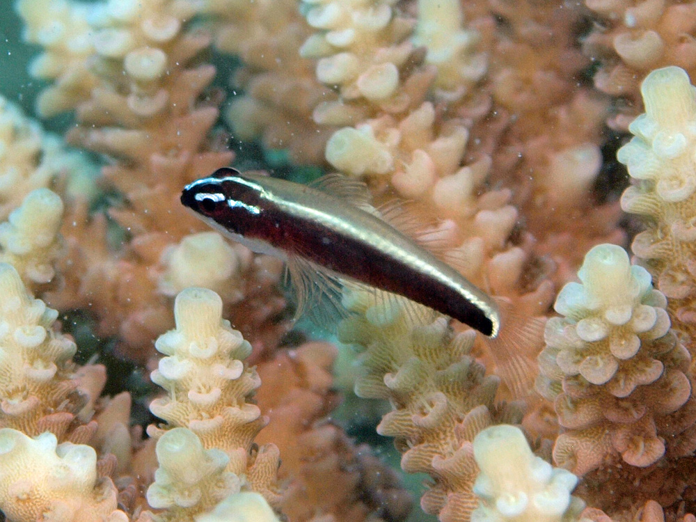 全長は2〜3cmといったところで、本来は撮りにくい魚ですが動きがいつもよりのんびりしている感じだったので、そのぶん助かりました。体を縦に走る帯は実際はもっと赤味が強かったのですが、正確な色で写すことができませんでした。