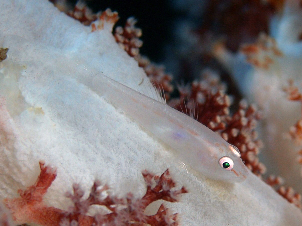 ガラスハゼ属の一種であることは確実ですがスケロクウミタケハゼかどうかには、ちょっと疑問が・・・「日本のハゼ」(平凡社)で一番それらしい種類はそれなのですが、トゲトサカ類が生息環境だと記述されているのに、ここはヤギ類の上です。