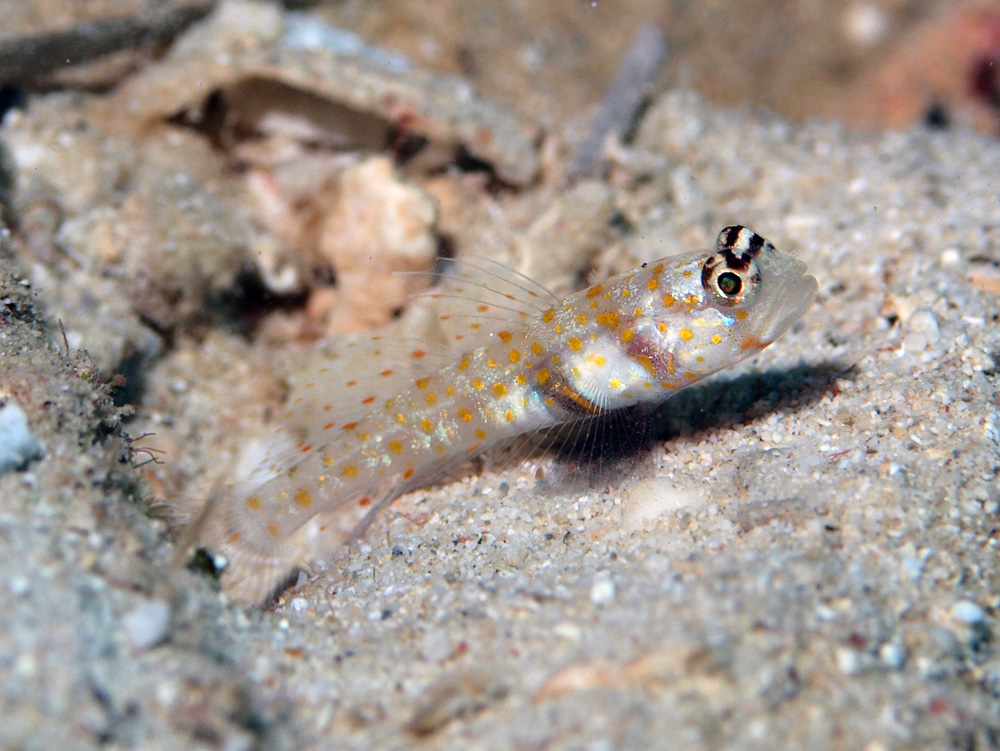 撮影 2004/07/19 沖縄県 石垣島 掲載 2015/05/27 ⇒ハゼの仲間 幼魚です。成魚の半分以下のオチビちゃん。 山吹色の水玉模様が不器用に整列しているところが子どもらしくてかわいく感じます。
