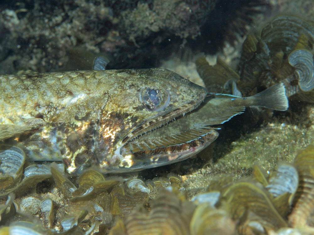 撮影 2011/09/27 沖縄県 沖縄島 掲載 2015/06/14 ⇒エソの仲間 口いっぱいに獲物の魚を咥えています。 ちょっと残酷ですが、捕えられた魚は時折尻尾をピクピク動かしていました。でも、これではもうどうにもならない・・・自然界の現実です。