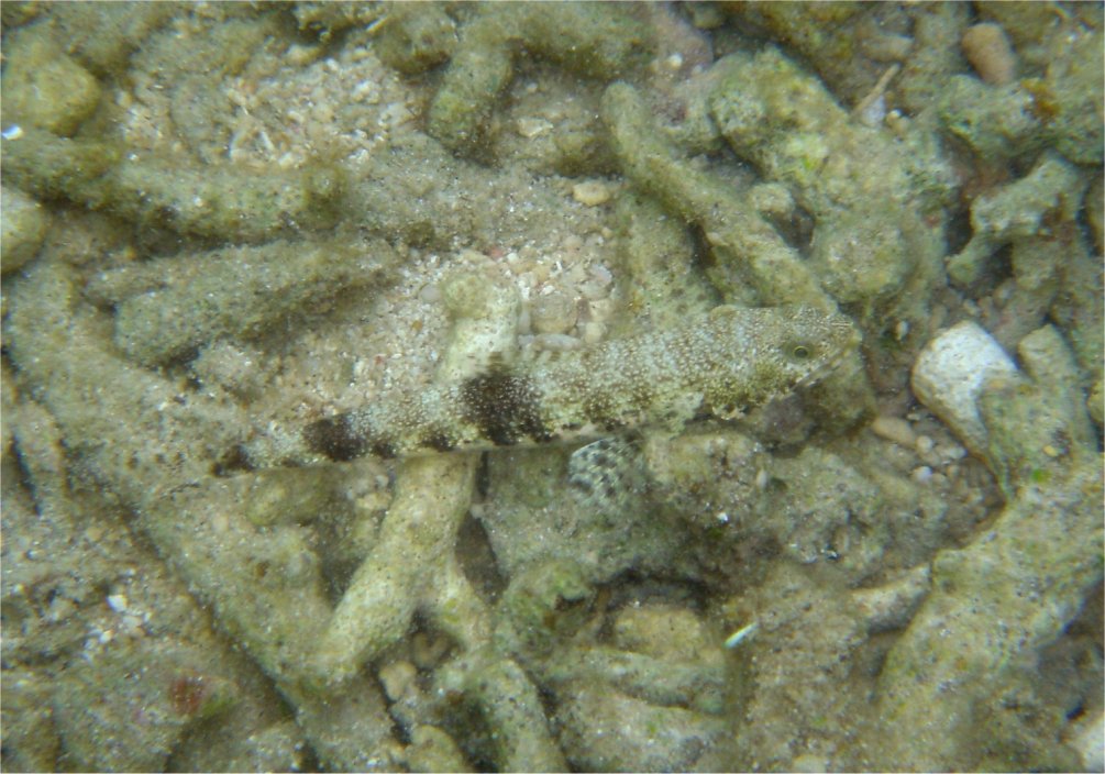 海水浴場、米原ビーチの水深1mの底でジーっと餌が近寄ってくるのを待っていました。エソの仲間は大体辛抱強くて、人間が近づいてもなかなか動かず、手や体の一部が触れそうなところまでになるまで我慢しています。