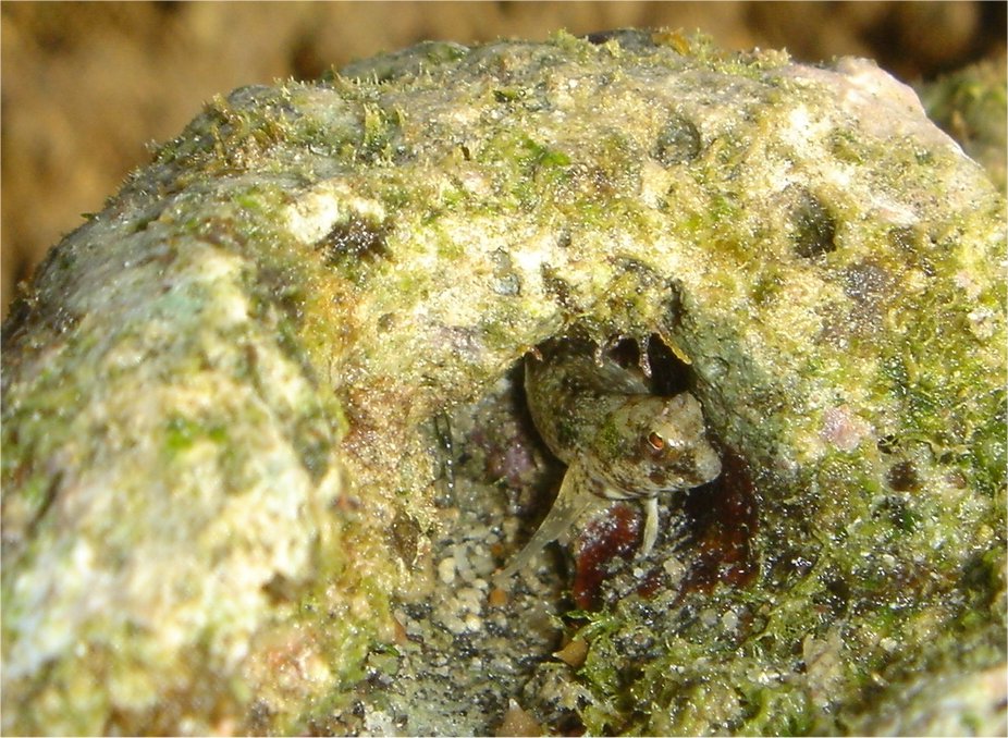 リゾート前の磯で潮溜まりを見ていたら、そこからピョンピョンと跳ね上がって潮上の岩の穴に飛び込んだ魚がいて、びっくりしました。この写真は海草が濡れているために一見すると水中で撮ったように見えますが、陸上で撮ったものです。