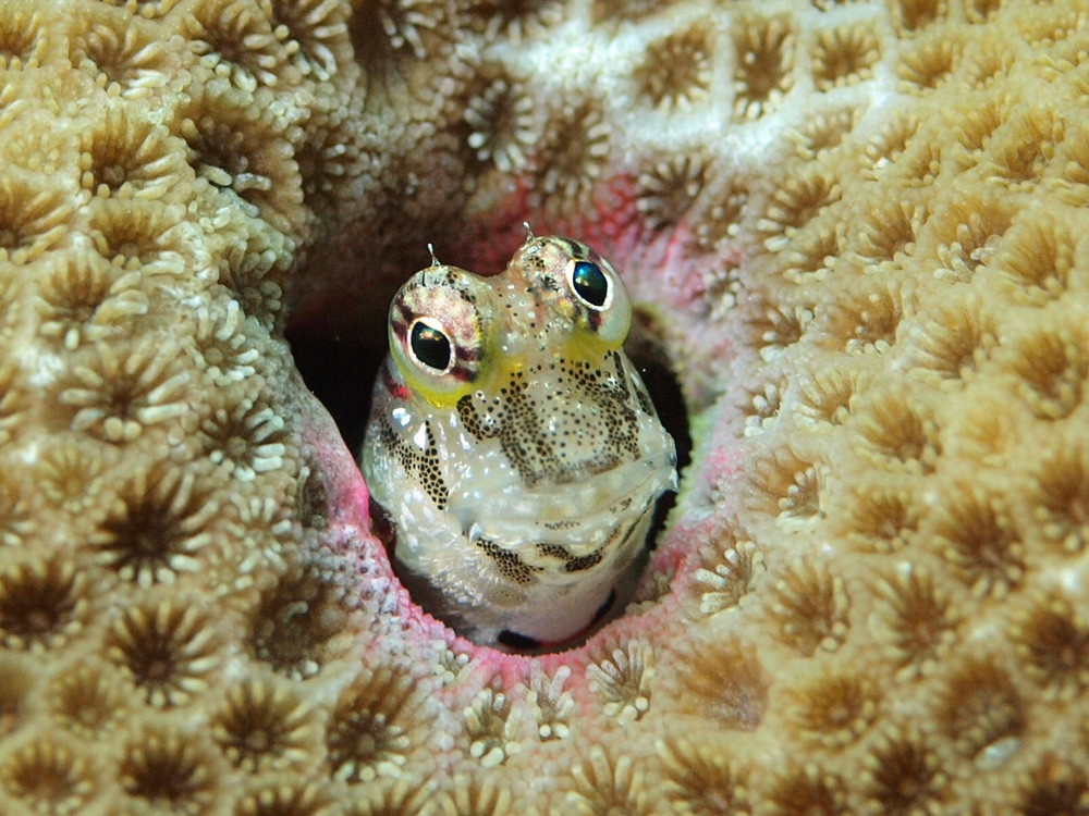 撮影 2012/06/02 沖縄県 沖縄島 掲載 2015/10/10 ⇒イソギンポの仲間 色白タイプが撮れたので追加しました。 頭部にほんのりピンク色が見えますが、住居の出入り口にもピンクをあしらってコーディネートしたりして、ニクイねー。