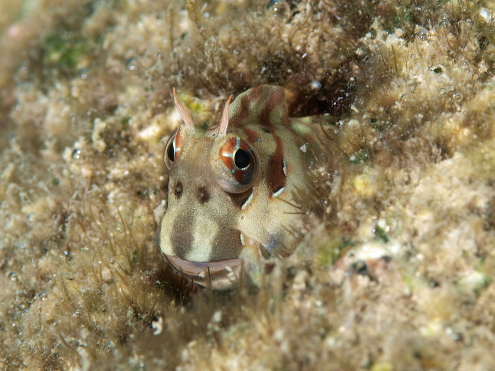 撮影 2009/06/18 沖縄県 石垣島 掲載 2014/02/07 ⇒イソギンポの仲間 巣穴から顔を出して落ち着いているときは、こんなとぼけた愛嬌のある顔をしています。サーカスに入団すれば天然ピエロとして人気者になるなあ。