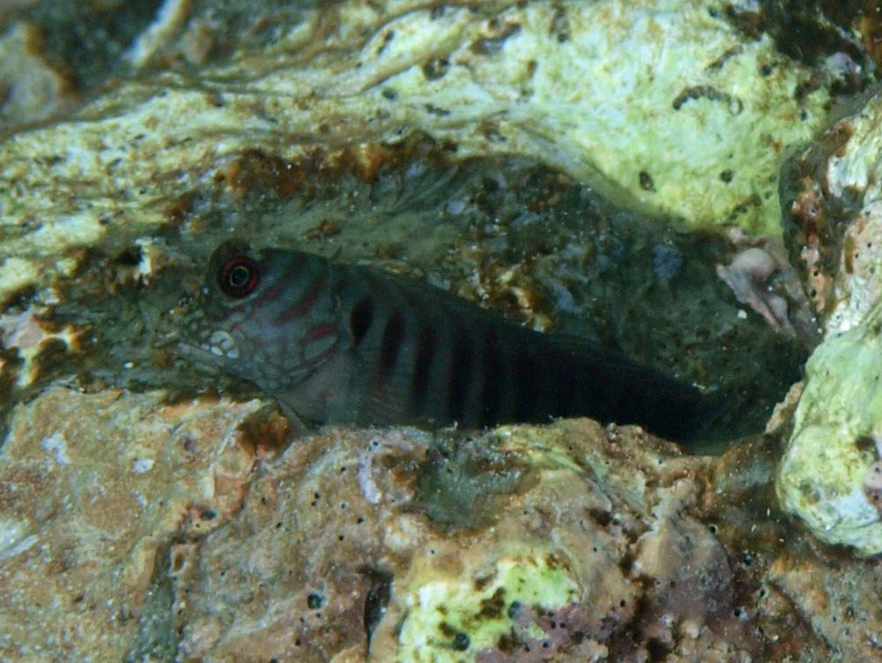 ミノカエルウオ似ですが、口元の網目(?)模様が違います。他にもいろいろあたったのですが、体側の横縞模様+口元の網目模様の組み合わせは見つけられませんでした。どこにでもいるタイプだと思うんだけどなあ〜。