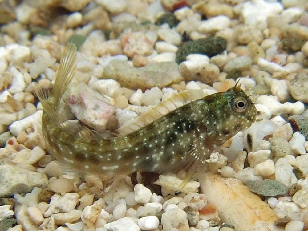 撮影 2008/05/18 沖縄県 石垣島 掲載 2012/11/03 ⇒イソギンポの仲間 『日本産魚類検索』 全種の同定 中坊徹次編 (2000年第2版 東海大学出版会)によるとサンゴ礁域の岩礁性海岸に生息します。この個体はトサカがないので、雌。
