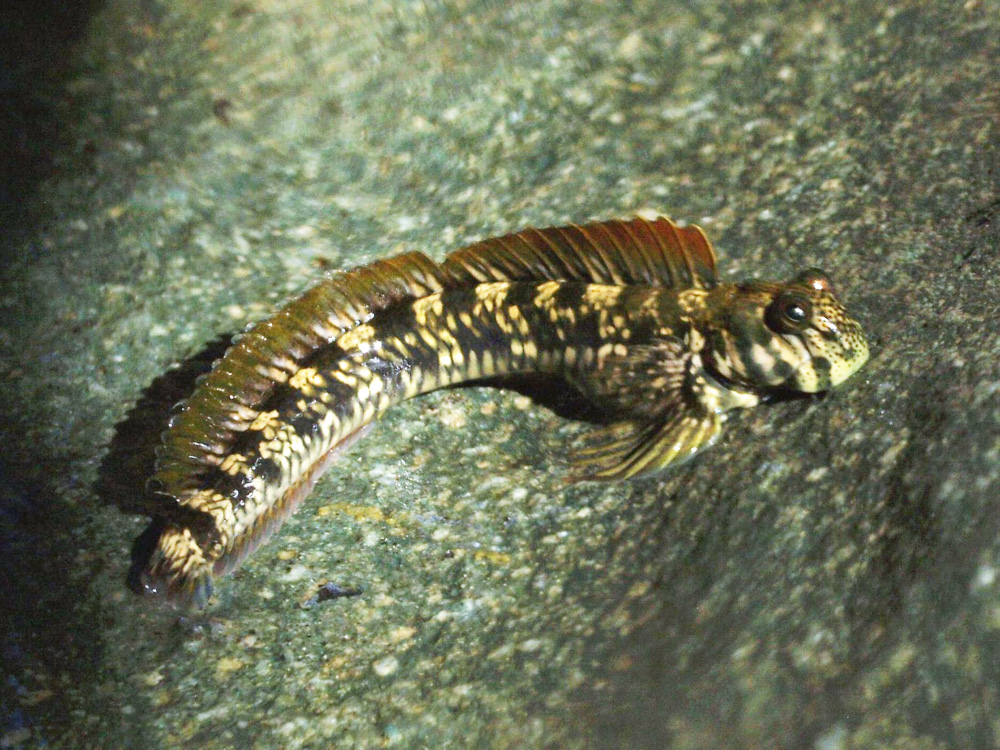 撮影 2008/05/08 沖縄県 石垣島 掲載 2012/10/12 ⇒イソギンポの仲間 ヨダレカケと同様、岩礁の飛沫帯にいました。水に入るのが嫌いで、基本は海面より上にいます。この個体はトサカが小さいのでメスですね。背びれが思い切り開いているのがウレシイ。