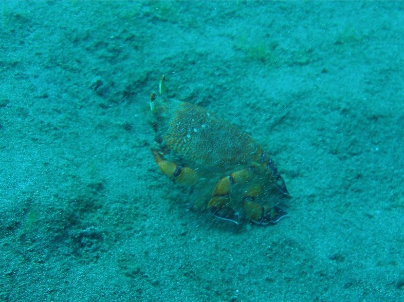 「海の甲殻類 」 (文一総合出版)他の図鑑にに掲載されている写真は甲の色が赤またはエンジなのに、この被写体は黄緑色でぜんぜん違うのですが、体型やトゲ状の粒が前方に向けて生え揃っている点からアサヒガニとしました。