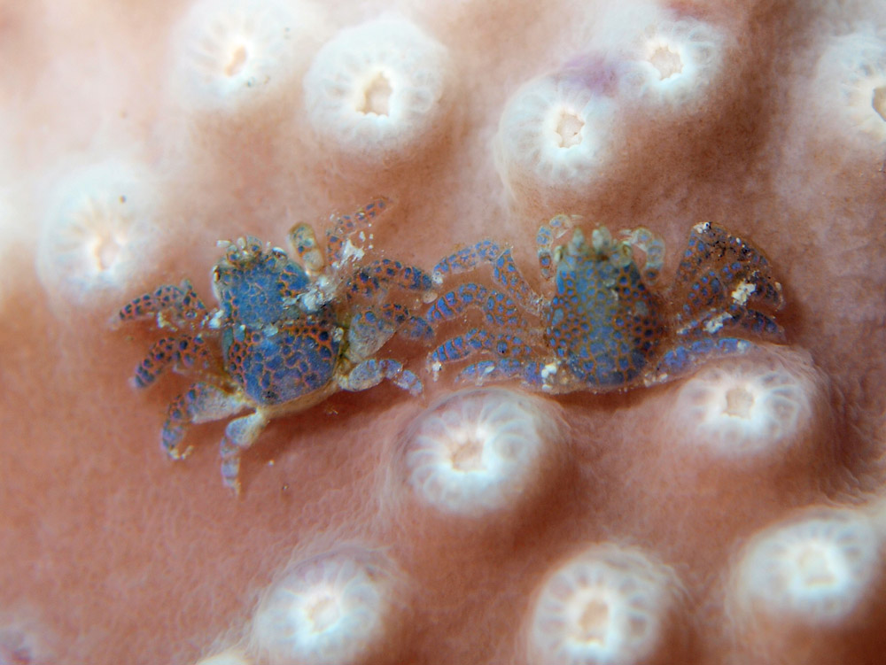 ペアのアシビロサンゴヤドリガニです。といっても、別々にいたのをガイドがツンツンと軽く押してくっつけたヤラセですが。