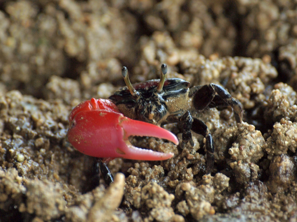 オキナワハクセンシオマネキと同じ環境に混在していました。この種は、甲羅は写真の色や、紅色や、そのほかいろいろ変化に富みますが雄のはさみ脚が共通してどちらか片方が非常に大きくて紅色なのが特徴です。