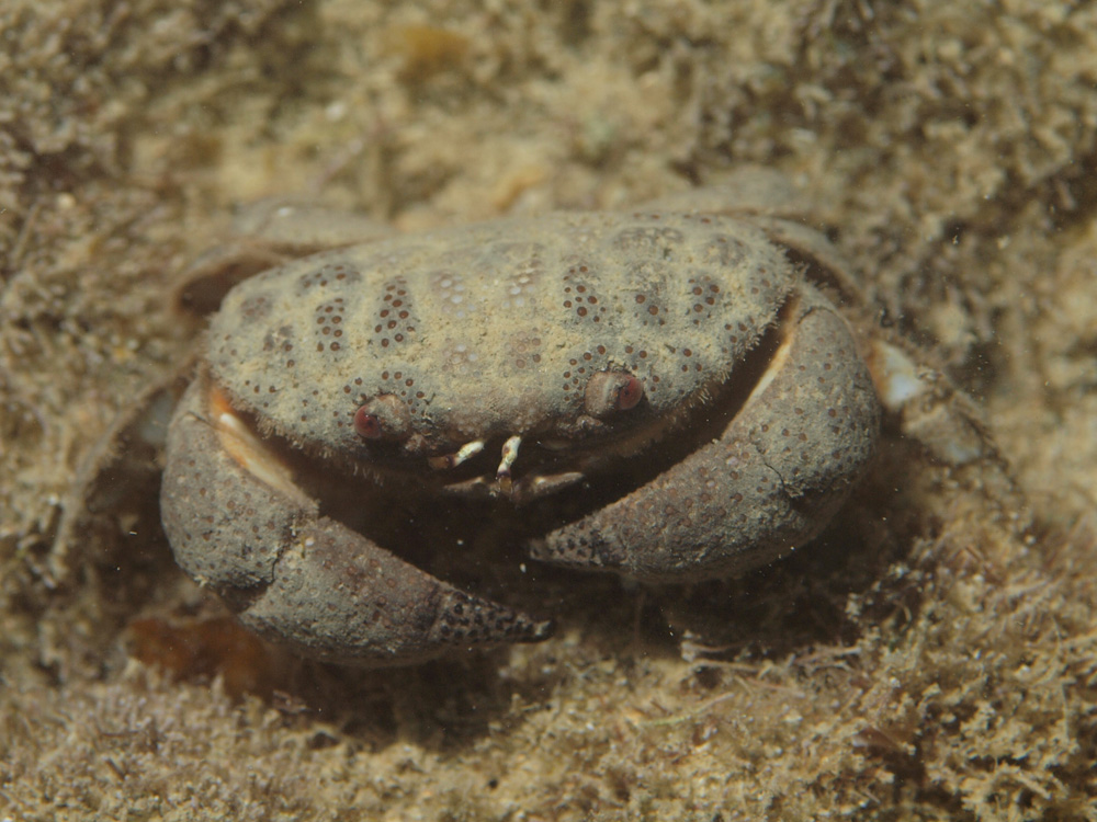 撮影 2013/11/28 沖縄県 沖縄島 掲載 2020/04/26 ⇒カニの仲間 お行儀良くこっちを向いてジーッとしています。本心は怖くて、すくんで、固まっちゃっているんでしょう。驚かしてスミマセン、2〜3回シャッターを切ったらすぐに立ち去りますから我慢してください。
