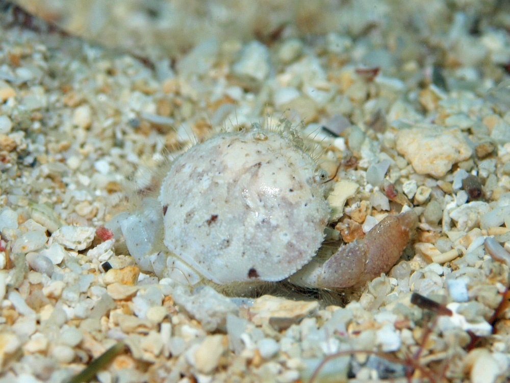 撮影 2012/07/31 沖縄県 沖縄島 掲載 2015/11/09 ⇒カニの仲間 こちらは白い碁石というよりはアサリの模様の方が近そうな個体です。甲の形がまん丸な点は既掲載の個体と同じ(同種なんだから当たり前ですが)でやっぱりカワイイなあ。
