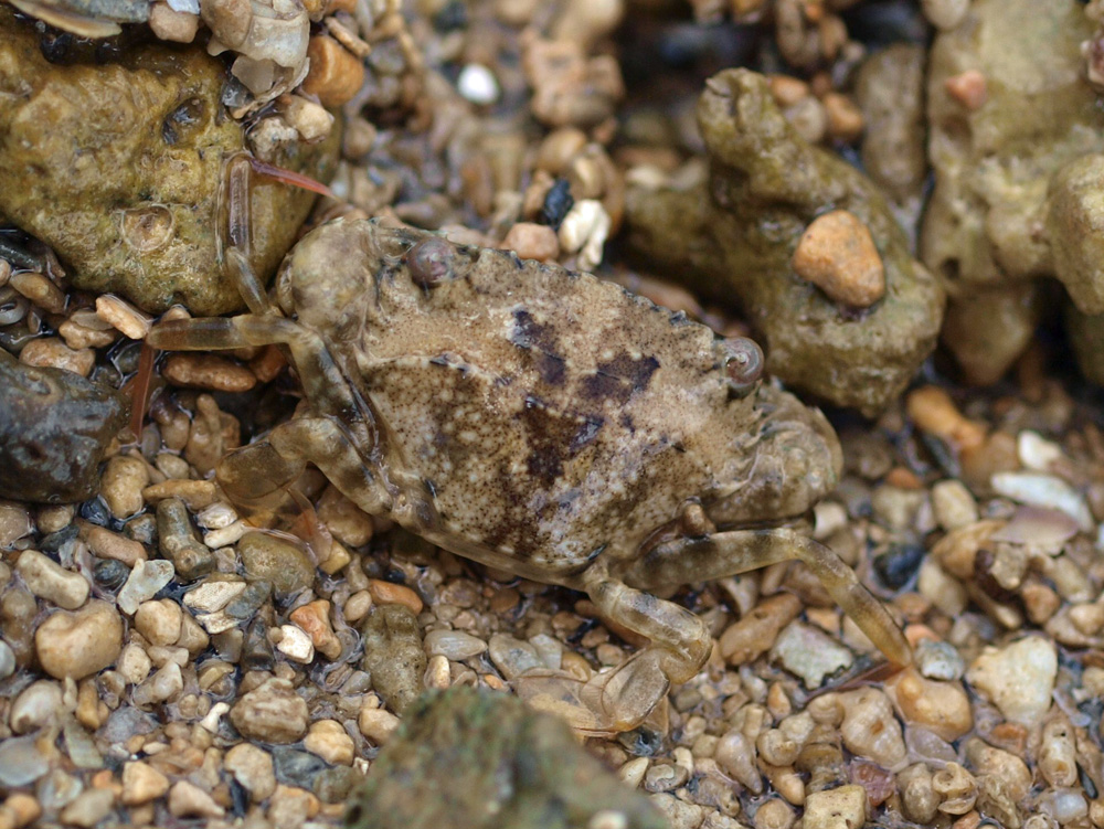 「体は淡褐色と暗褐色のまだら状。歩脚の長節から前節に暗褐色の幅広い横縞が、指節に橙色の細い横縞模様があるが若い個体では不鮮明。」と『海の甲殻類』 峯水亮/武田正倫/奥野淳児 (2002年初版2刷 文一総合出版)で解説しています。