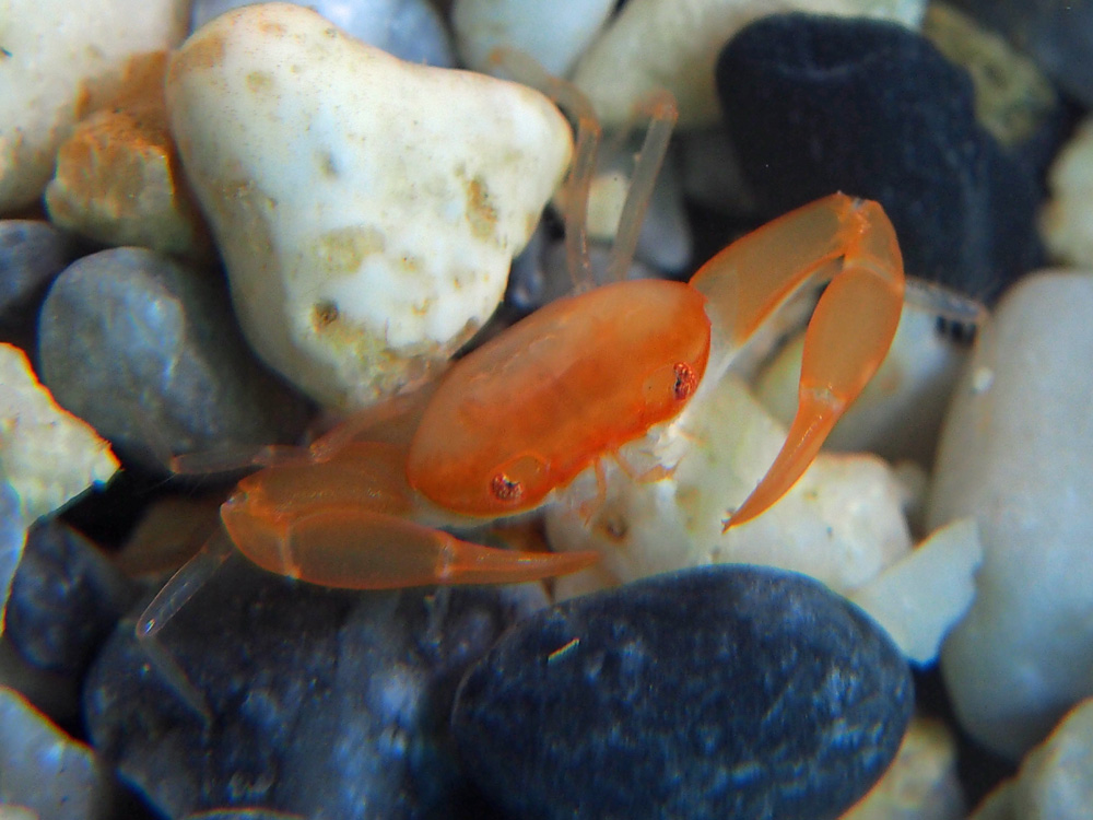 撮影 2013/01/07 沖縄県 沖縄島 掲載 2016/03/14 ⇒カニの仲間 オー、こういう感じのカニさんとの出逢いは初めてです。嬉しいなあ。 半透明でツルツルスベスベで触ったらすぐに潰れちゃいそうで、ボクの接近に怯えているようでした。驚かせてごめんなさい、すぐに退散します。