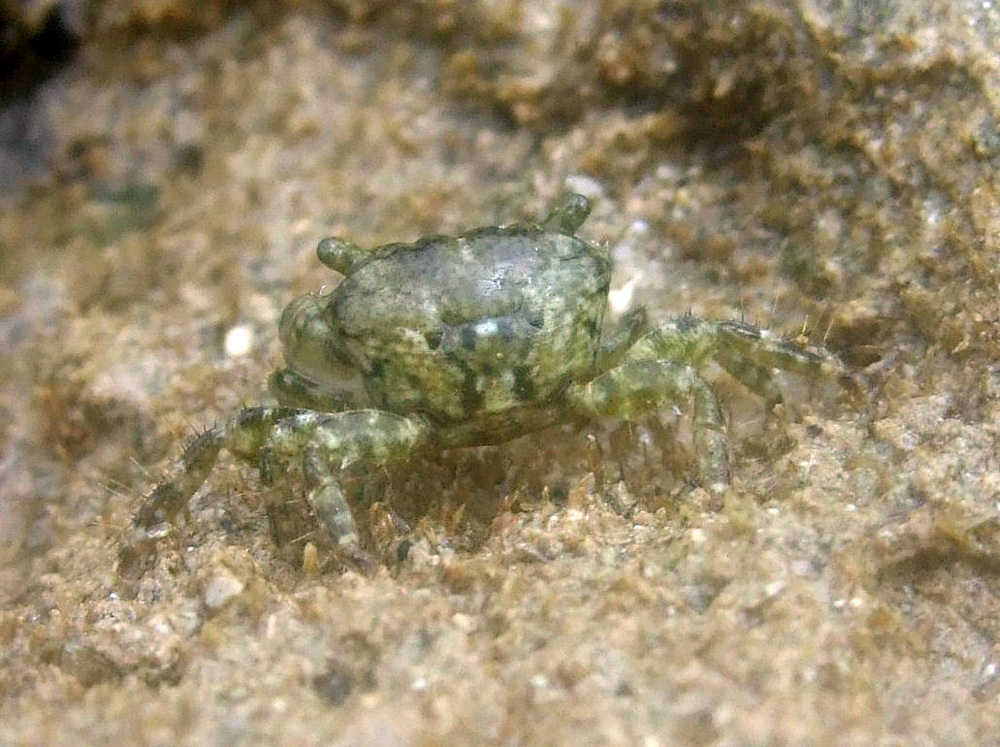 干潮時の礁原で撮りました。甲の幅は8mmくらい。『海の甲殻類』 峯水亮/武田正倫/奥野淳児 (2002年初版2刷 文一総合出版)の解説によると、「体は緑褐色のまだらで、甲面に淡青色の斑紋が3対ある。〜」となっています。