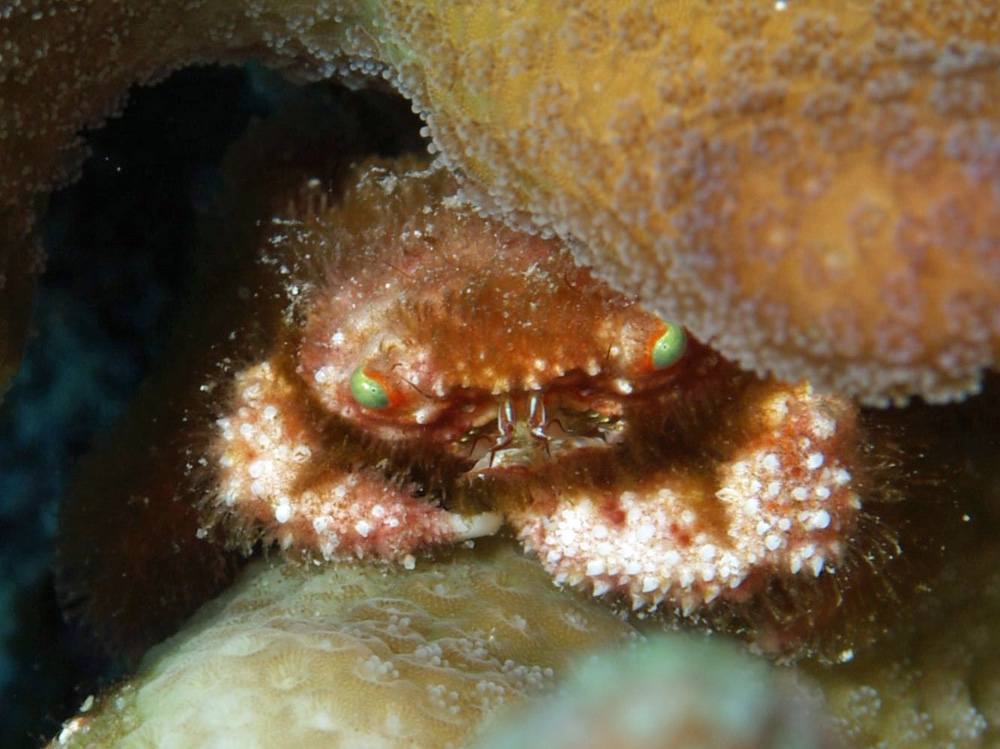 撮影 2008/06/07 沖縄県 石垣島 掲載 2012/11/24 ⇒カニの仲間 甲幅2cm程度。小さいけれどこの眼には力がありますね〜。由緒ある寺を守る仁王の眼を連想します。 きっとこの眼力でサンゴの森を守ろうとしているのです。健気だな〜。