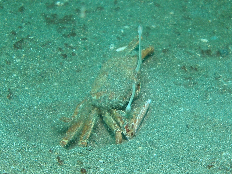 あと、「原色日本大型甲殻類図鑑 U」 三宅貞祥 (1983年初版 保育社)に記載されているのはヒメメナガガザミだけ。ヒメメナガガザミは淡褐色で、はさみ脚に暗褐色の斑紋が散在するそうで、この被写体の体色は○ですが、はさみ脚に砂がかぶっていて“暗褐色の斑紋”は確認しがたい状態です。写真はもう1枚あるのですが、そっちはもっと砂がかかっていて全然分からず。
