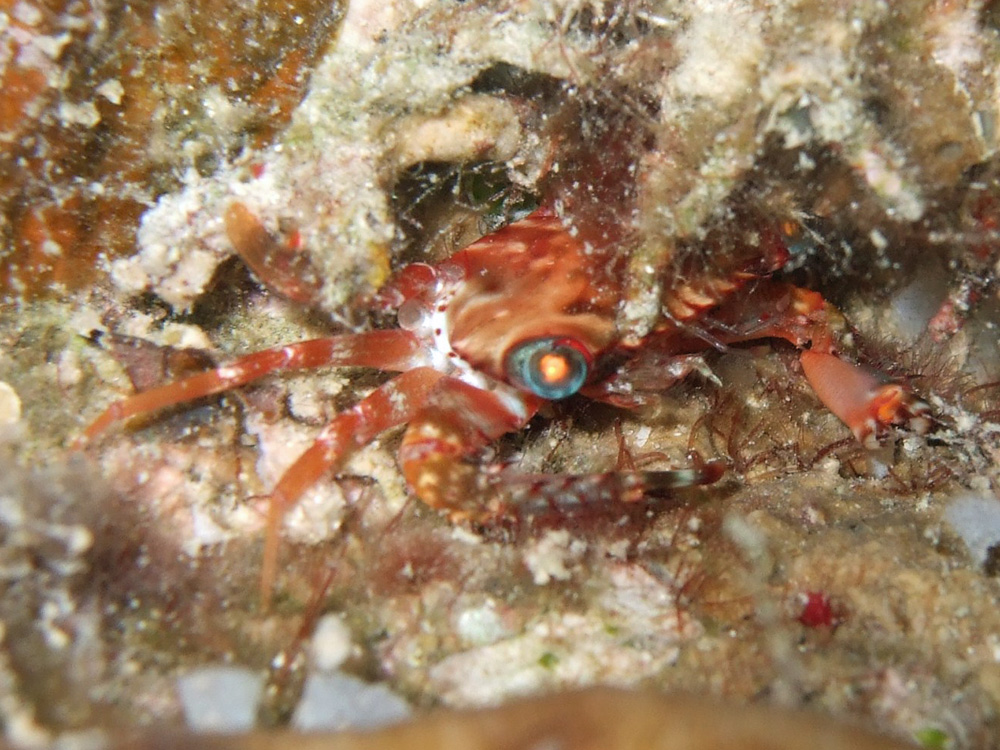 ナイトダイビングで岩陰に隠れているカニを見つけました。