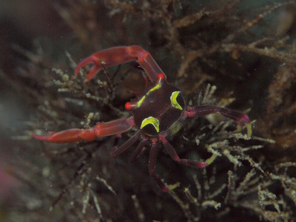 撮影 2013/03/07 沖縄県 沖縄島 掲載 2016/08/23 ⇒カニの仲間 背中の三日月がはっきり見える写真が撮れました。現掲載の写真は三日月が見えませんが被写体の挑戦的な姿勢が気に入っているので差し替えせずに、こちらを追加します。